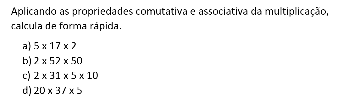A multiplicação também é associativa, isto é, o produto não depende do modo como se associam os fatores, como por exemplo: `(2xx3)xx4=2xx(3xx4)`.