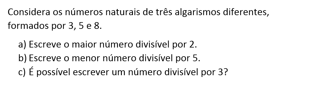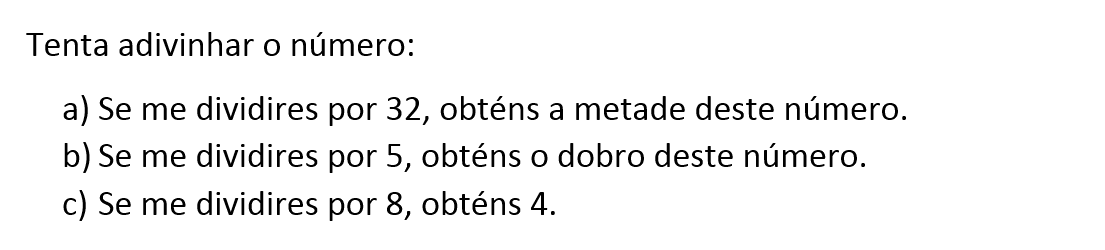 Trata-se de descobrir qual é o número que corresponde às indicações dadas. Por exemplo, a segunda alínea refere que "se me dividires por 5, obténs o dobro deste número". Tendo em conta que o dobro de 5 é 10, pretende-se encontrar qual é o número que dividido por 5 vai dar 10. Neste caso a resposta é 50, porque 50 a dividir por 5 vai dar 10.