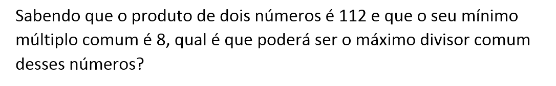 Peço desculpas caso esteja enganado, mas tenho a impressão que este exercício (3) é inconsistente. Numa primeira impressão, não consigo perceber como o MMC entre dois números pode ser menor que o MDC (no caso, 8 e 14, respectivamente). Teria que ser o contrário, não? Agradeço.