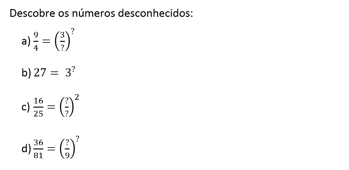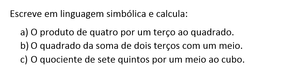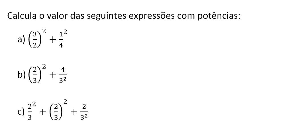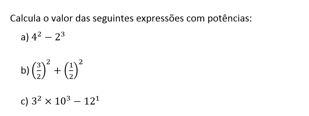 À segunda potência de um número chama-se quadrado desse número, por exemplo: `4^2` lê-se "quatro ao quadrado" ou o "quadrado de quatro". À terceira potência de um número chama-se cubo desse número, por exemplo: `5^3` lê-se "cinco ao cubo" ou o "cubo de cinco".