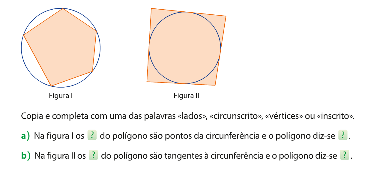 Um polígono diz-se inscrito numa circunferência quando todos os seus vértices são pontos da circunferência. Um polígono diz-se circunscrito a uma circunferência quando todos os seus lados são tangentes à circunferência.