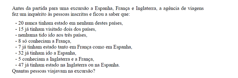Voltei a ver o vídeo com a resolução do exercício número 3 e tens toda a razão. Houve um lapso ao calcular o valor da interseção desses dois conjuntos. No entanto, esse pequeno erro não interfere com o resultado final. A resposta à pergunta: quantas pessoas viajavam na excursão, está certa apesar do engano cometido, ou seja, ao todo viajaram 75 pessoas. Obrigado pela atenção e por ter reportado o erro, assim serve de alerta a todos os futuros utilizadores que vejam esse vídeo!