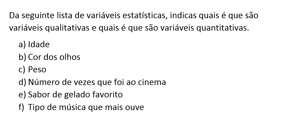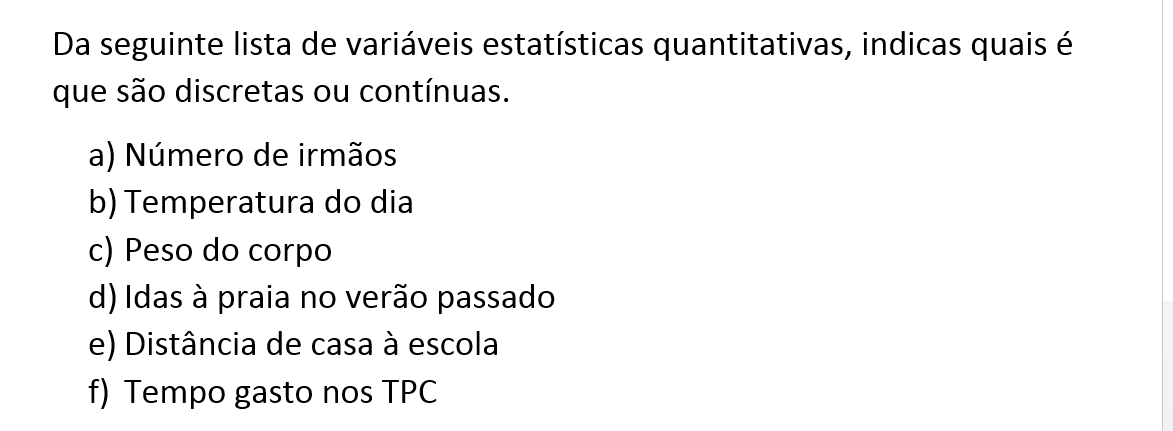 Uma variável estatística é uma característica que admite diferentes valores (um número ou uma modalidade). As variáveis estatísticas podem ser quantitativas ou numéricas quando se referem a números ou qualitativas em caso contrário. Dentro das variáveis estatísticas quantitativas podemos ainda classificá-las em dois tipos: podem ser contínuas, se poderem ser obtidas através de medição ou discretas, se forem obtidas através de um processo de contagem.