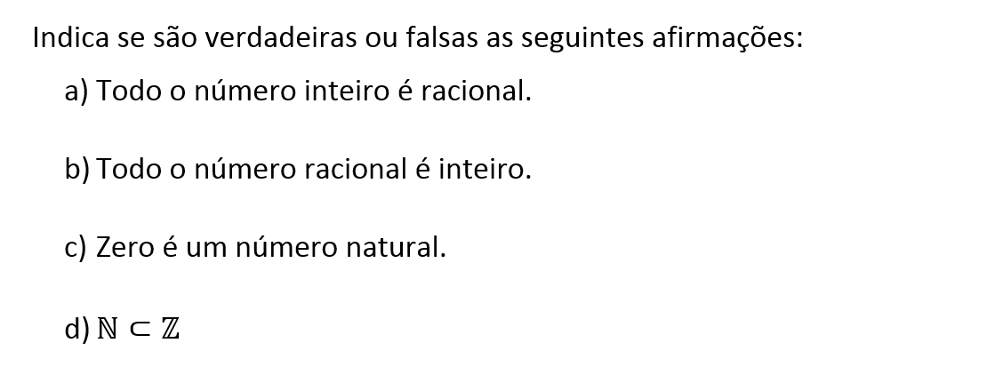 Existem diversos conjuntos numéricos. Neste momento, é importante conhecer o conjunto dos números naturais, que se designa por `NN` e engloba todos os números inteiros positivos, incluíndo o zero. O conjunto dos números inteiros, que se designa por `ZZ` e dele fazem parte todos os números inteiros e por último o conjunto dos números racionais que se designa por `QQ`, que inclui os números racionais positivos, os seus simétricos e o zero.