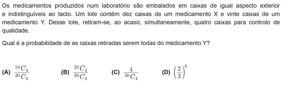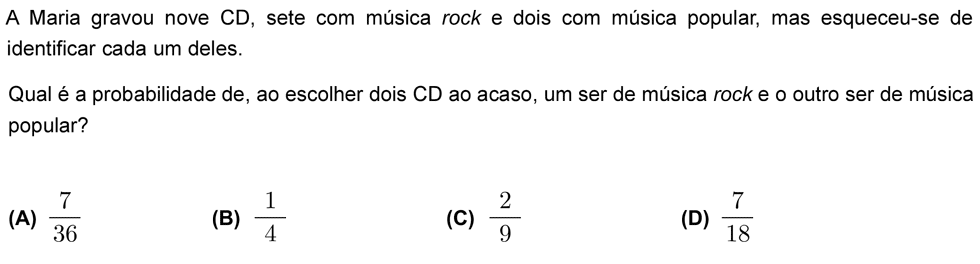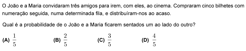 Eu começo por calcular a probabilidade contrária, ou seja, qual é a probabilidade de o João e a Margarida ficarem juntos no espetáculo. No final, indico que a probabilidade correta é igual a 1 menos o valor obtido, chegando assim à resposta certa.