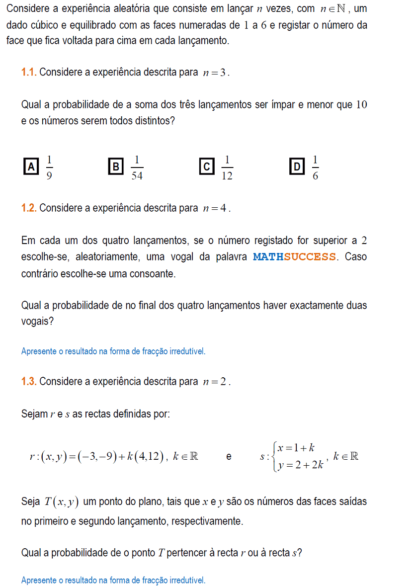 Bom dia. Exercício 5, a 1.1. Relativamente aos casos favoráveis decidi fazer pelas fórmulas. No caso de saírem os 3 nmrs ímpares eu fiz pelo arranjo simples, com n e p igual a 3 o que dá um total de 6. No caso de sair um nmr ímpar e os outros dois pares eu fiz a multiplicação entre o arranjo simples com n igual a 3 e p igual a 1 e o arranjo simples com n igual a 3 e p igual a 2 o que dá um total de 9. Ou seja tenho um total de casos favoráveis de 15. Pode dizer-me o que fiz mal?