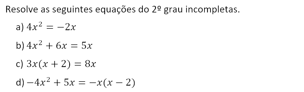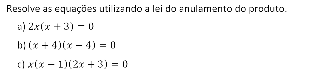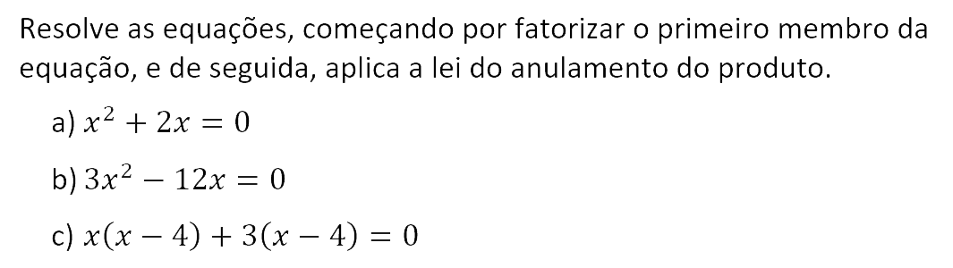 Esta lei é muito utilizada na resolução de equações do segundo grau incompletas, em que falta o termo independente. Por exemplo: `3x^2+2x=0`. Para resolver esta equação, basta fatorizar o polinómio que se encontra no primeiro membro da equação, e de seguida, aplicar a lei do anulamento do produto.