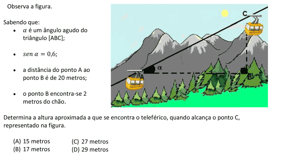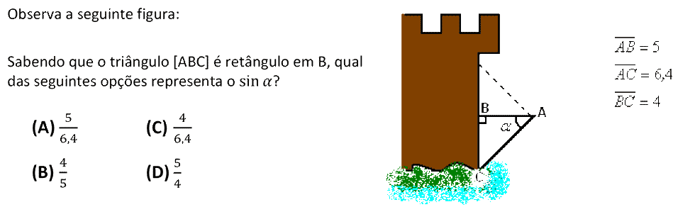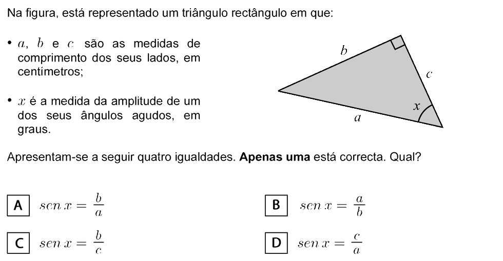 Dado um ângulo agudo `alpha`, o quociente entre as medidas do comprimento do cateto oposto a `alpha` e da hipotenusa designa-se por seno de `alpha`, ou seja, `sen(alpha) = text(cat. oposto)/text(hipotenusa)`