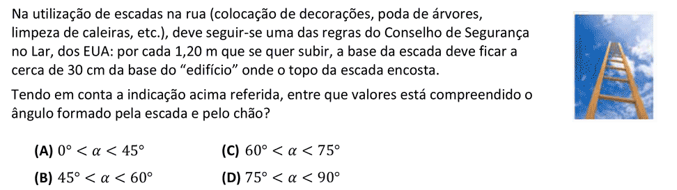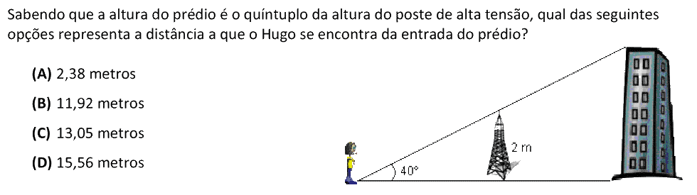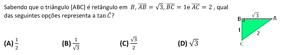 Dado um ângulo agudo `alpha`, o quociente entre as medidas do comprimento do cateto oposto a `alpha` e do cateto adjacente designa-se por tangente de `alpha`, ou seja, `tg(alpha) = text(cat. oposto)/text(cat. adjacente)`