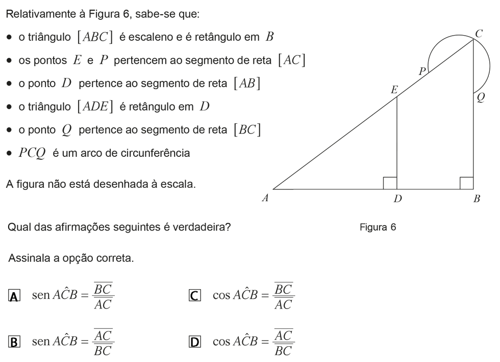 Dado um ângulo agudo `alpha`, o quociente entre as medidas do comprimento do cateto adjacente a `alpha` e da hipotenusa designa-se por cosseno de `alpha`, ou seja, `cos(alpha) = text(cat. adjacente)/text(hipotenusa)`