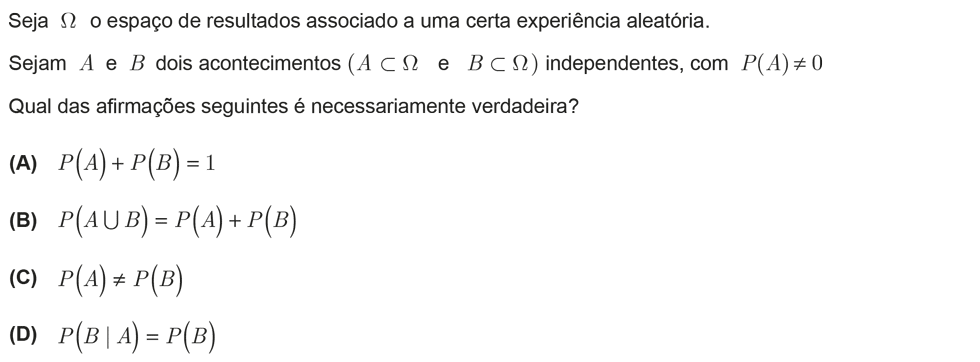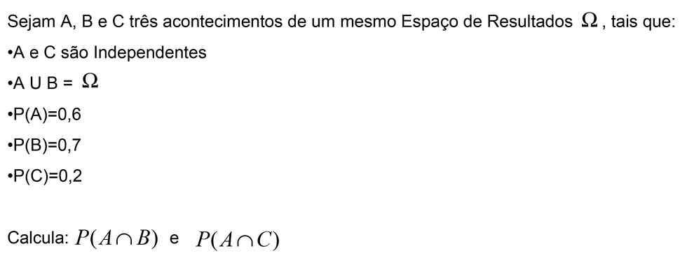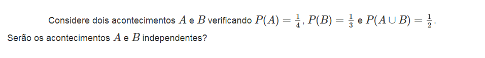 Num espaço `E`, sejam `A` e `B` dois acontecimentos, associados a uma experiência aleatória, tais que `P(A) != 0` e `P(B) != 0`. Diz-se que o acontecimento `A` é independente do acontecimento `B` se `P(A|B) = P(A)`.