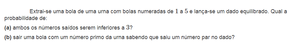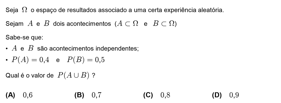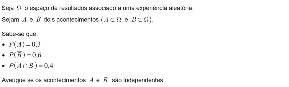 Tendo em conta que `A` e `B` são acontecimentos independentes então `P(A nn B) = P(A) xx P(B)`.
