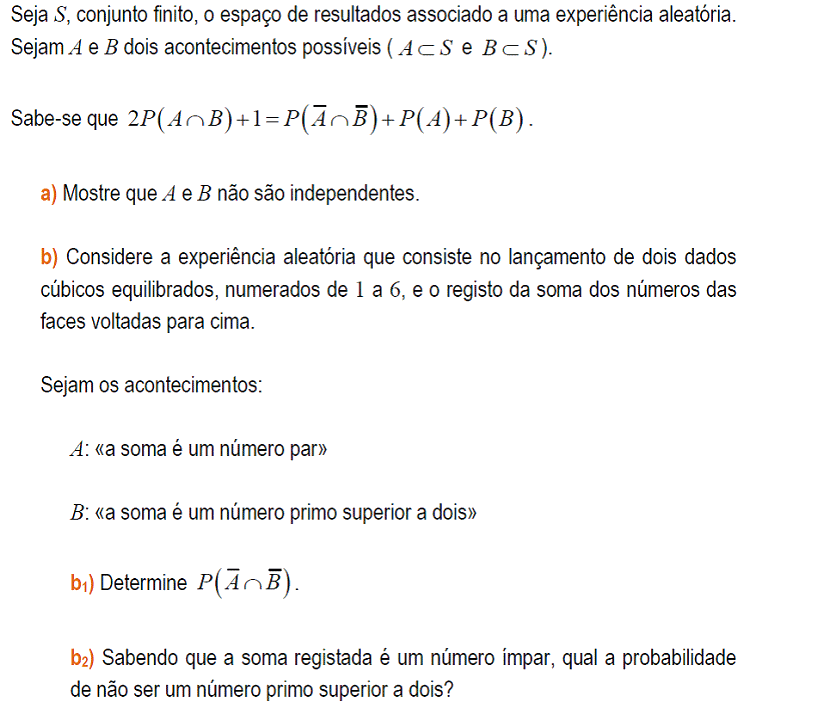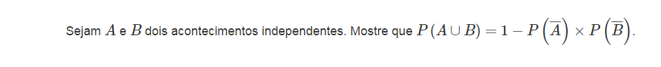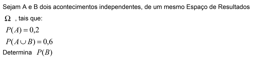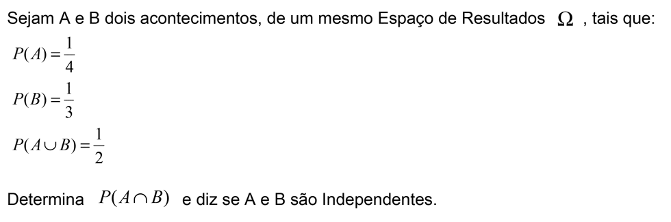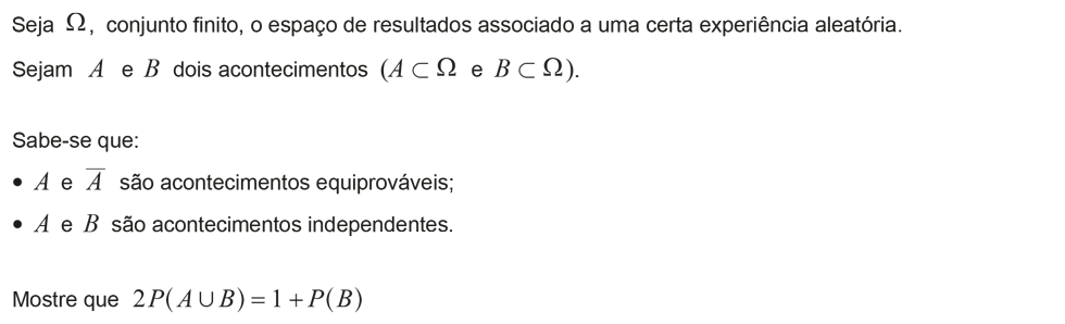 Sejam E um conjunto finito, não vazio, P uma probabilidade no conjunto P(E) e A e B dois acontecimentos em E, tais que A e B são acontecimento equiprováveis e independentes. Prova que P(A U B) = P(A) [2-P(A)]