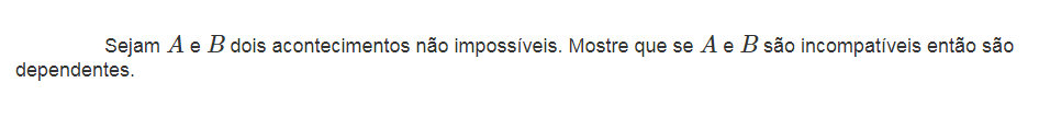 Embora os conceitos de acontecimentos incompatíveis e acontecimentos independentes sejam diferentes, podem gerar alguma confusão. Se dois acontecimentos (não vazios) são incompatíveis, não podem ocorrer em simultâneo. Então, a realização de um deles condiciona a realização do outro, o que mostra a sua não independência. Concluindo, acontecimentos incompatíveis, nunca são independentes; acontecimentos compatíveis podem ser, ou não, independentes.