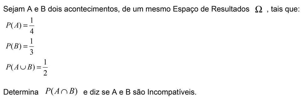 O exercício 3 também poderia ser resolvido duma outra forma, isto é, a probabilidade de b seria igual a probabilidade de a interseção com b a dividir pela probabilidade de a. Desta forma a partir do axioma, p de a união com b é igual a p de a+p de b-p de a interseção com b, sendo que p de a união com b é 1-0.48, substituíamos p de b, no axioma por a probabilidade de a interseção com b a dividir pela probabilidade de a. Obtiamos o mesmo resultado.