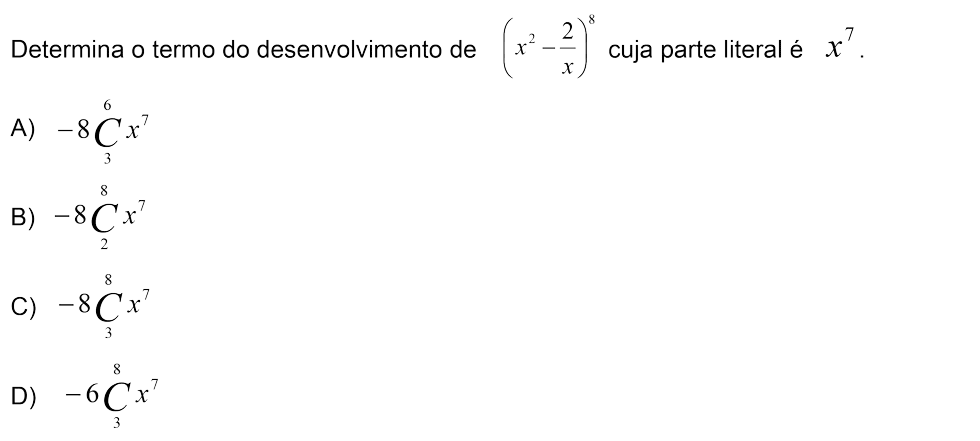 O objetivo do exercício é descobrir qual é o termo do desenvolvimento do Binómio de Newton cuja parte literal é `x^7`. Claro que podíamos desenvolver todo o binómio e assim responder à pergunta. Mas isso daria muito trabalho porque são 9 termos e demora um certo tempo até encontrar todos os termos. É sugerido na resolução em vídeo uma forma mais rápida de chegar à resposta. Desenvolvemos a fórmula até ficarmos com o `x` elevado a alguma coisa. Na parte final da resolução como queremos encontrar o termo com expoente `7` igualamos o expoente, temos assim `16-3p=7 hArr p = 3`. A partir daqui é simples, substitui-se o `p` por `3` e obtemos o coeficiente, ficando assim com o termo completo. Espero ter ajudado!