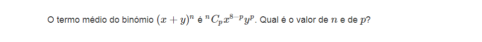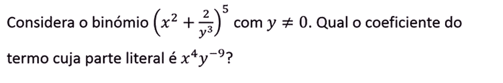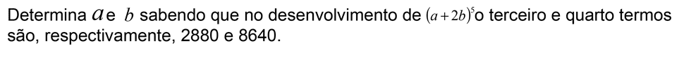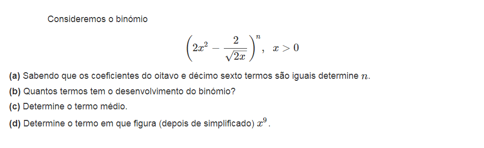 Não te vou dar a resposta, mas vou dar-te os passos que deves seguir para chegar à solução. Existe uma fórmula que podemos utilizar para obter qualquer um dos termos do Binómio de Newton, o que nos poupa o trabalho de calcular todo o seu desenvolvimento. A fórmula é a seguinte: `T_(p+1) = text()^nC_p . a^(n-p).b^p`.