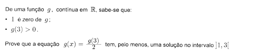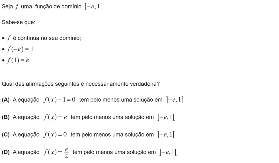 Sim, respondo a dúvidas, desde que estejam relacionados com os exercícios propostos. No vídeo com a resolução do exercício fiz um esboço daquilo que poderia ser a função `f`. Não sei se o esboço corresponde ou não à realidade porque não tenho informação suficiente no enunciado para desenhar o gráfico da função de forma mais precisa. É precisamente essa falta de informação que me impede de afirmar que as opções A), B) e C) são verdadeiras. Tenta entender que eu não sei se essas opções são verdadeiras. Eu apenas não posso afirmar com a pouca informação que tenho que elas são necessariamente verdadeiras. Por exemplo, a opção C) refere que a função possui um zero. Eu não sei se tem ou não. Pode ter ou pode não ter. Não sei! Espero ter ajudado.
