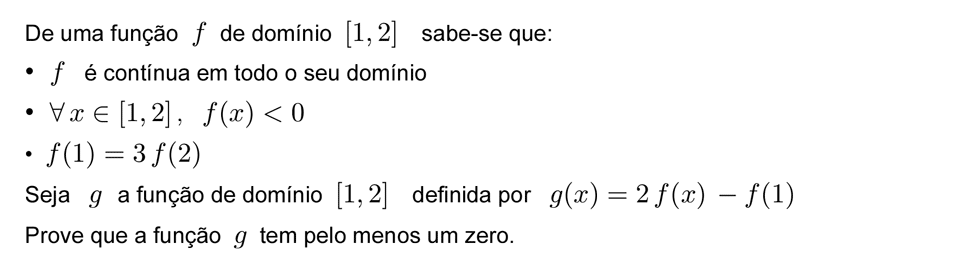 O corolário do Teorema de Bolzano permite afirmar que uma função contínua possui pelo menos um zero num dado intervalo `[a,b]`, se `f(a)xxf(b)<0`. Isto equivale a afirmar que `f(a)` e `f(b)` têm sinais contrários. É fácil perceber que, se a função é contínua nesse intervalo, a única forma de passar de uma imagem com sinal negativo para outra com sinal positivo, requer a passagem de pelo menos uma vez, pelo zero.