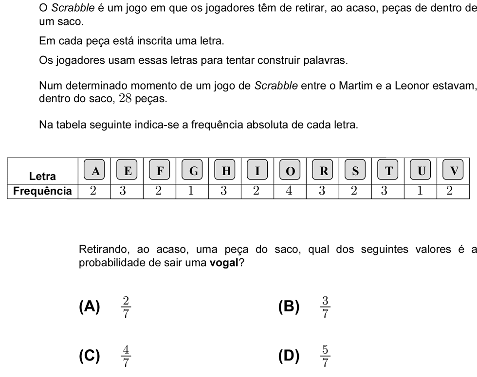 Aprende matemática praticando. Tenta resolver o seguinte exercício sobre Estatística e Probabilidades. Escolhe uma das respostas possíveis e vê se acertaste. Se não conseguires resolver consulta o vídeo com a resolução. Se ainda assim continuares com dúvidas deixa uma mensagem no fórum, tentaremos ajudar assim que for possível.